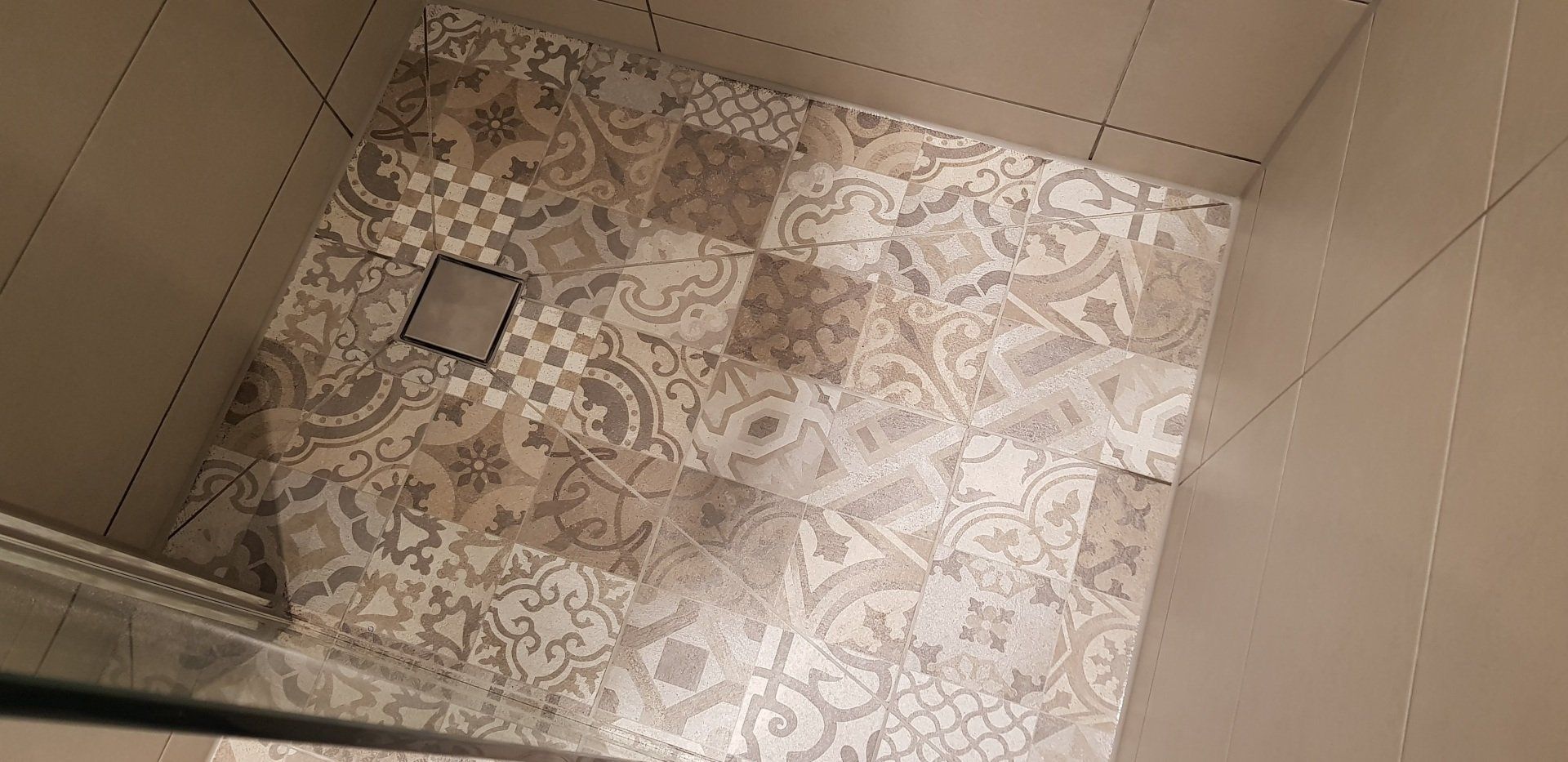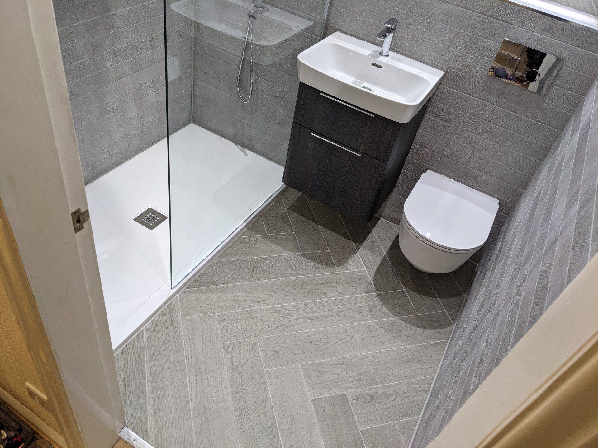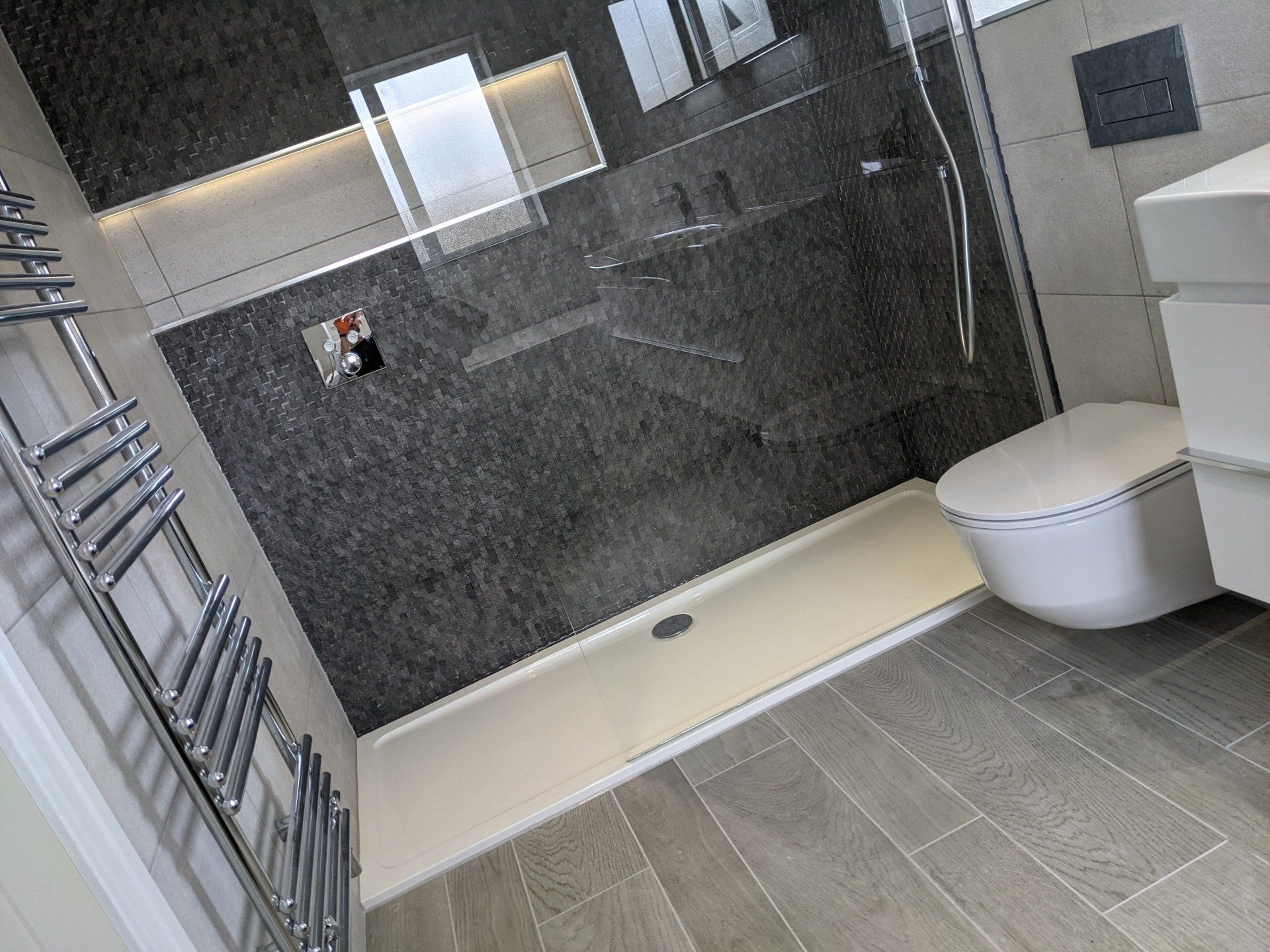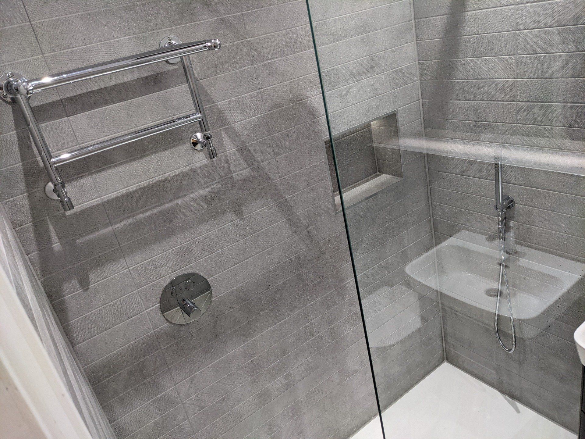 This project was to create a wetroom in a bungalow. In this instance we formed our own tray & fall into the concrete floor. The alignment of the detail in the tiles highlights the work that remains hidden.
