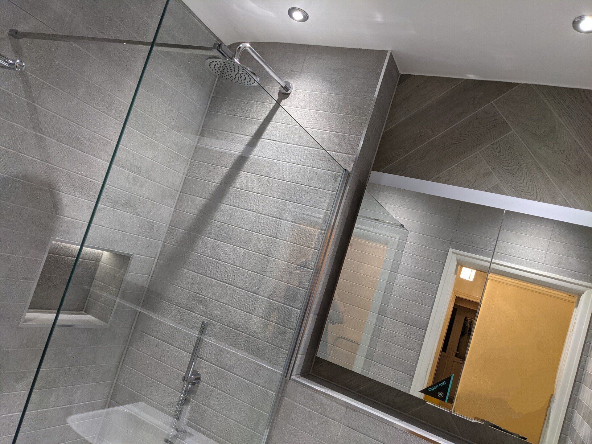 A full width walk in shower with a fixed glass panel and contrasting relief tiled feature walls. Within which is an LED lit alcove positioned above the concealed push button shower valve.