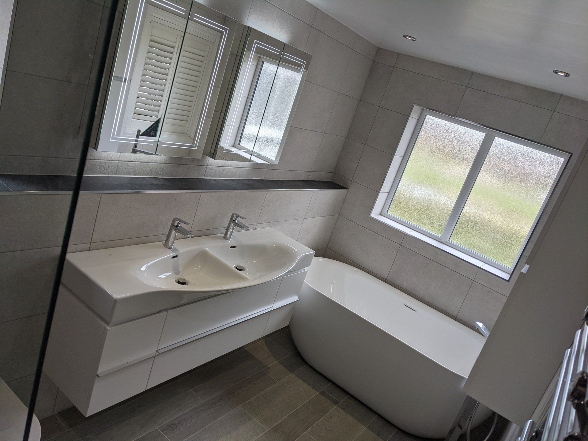Studwork was formed to create a space for the walk in shower tray, house the necessary plumbing work for the faucets and the WC & vanity framework. Constructed in a way to create a step back alcove for the his & hers mirror cabinets.