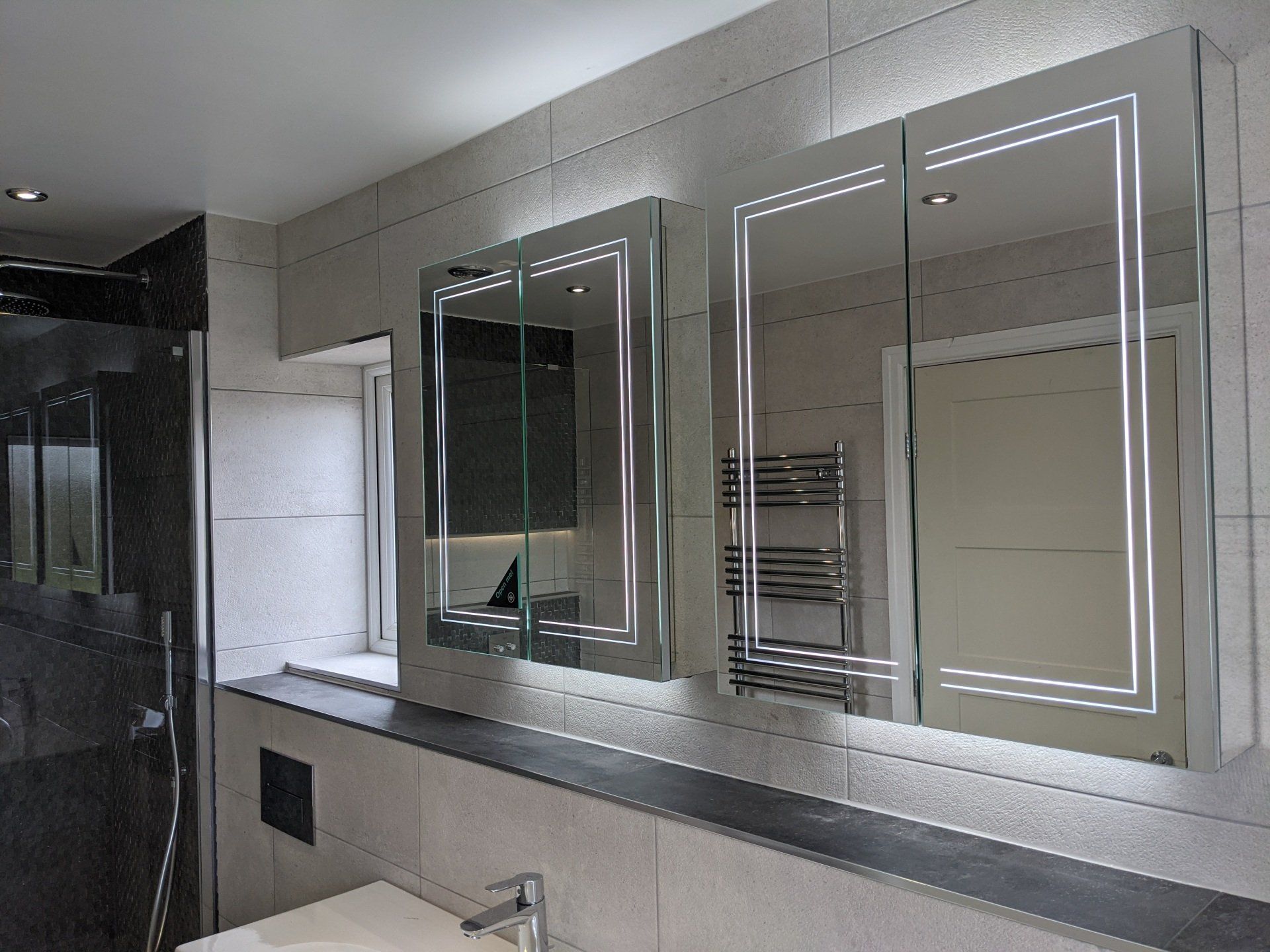 A high level heated towel holder and a push button shower valve ideally positioned to enter or exit the walk in shower respectively. Accompanied by an LED lit alcove to house any bottles.