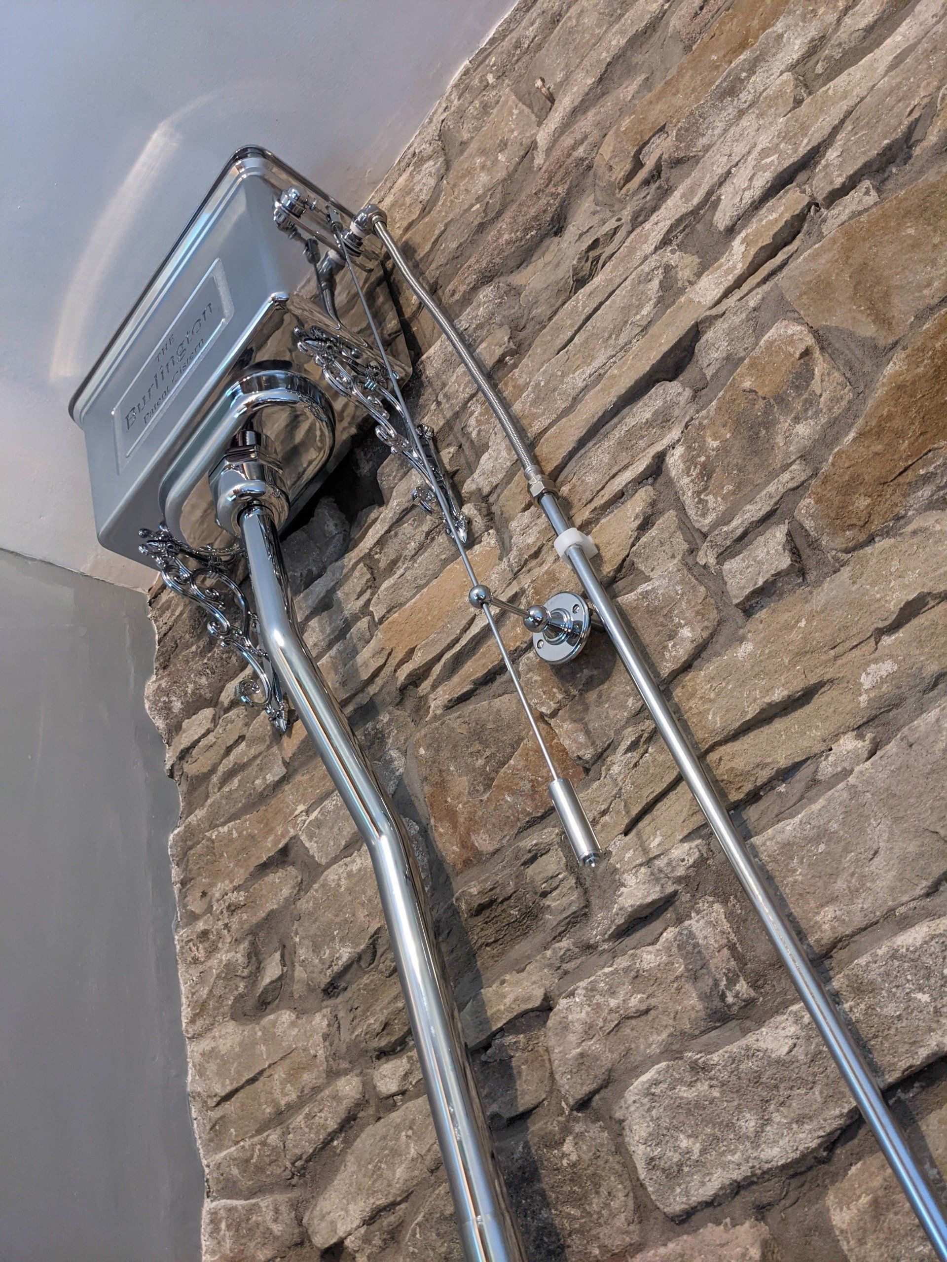 A stunning Burlington WC with a chrome high level cistern & flushpipe, fitted to an exposed stone wall.