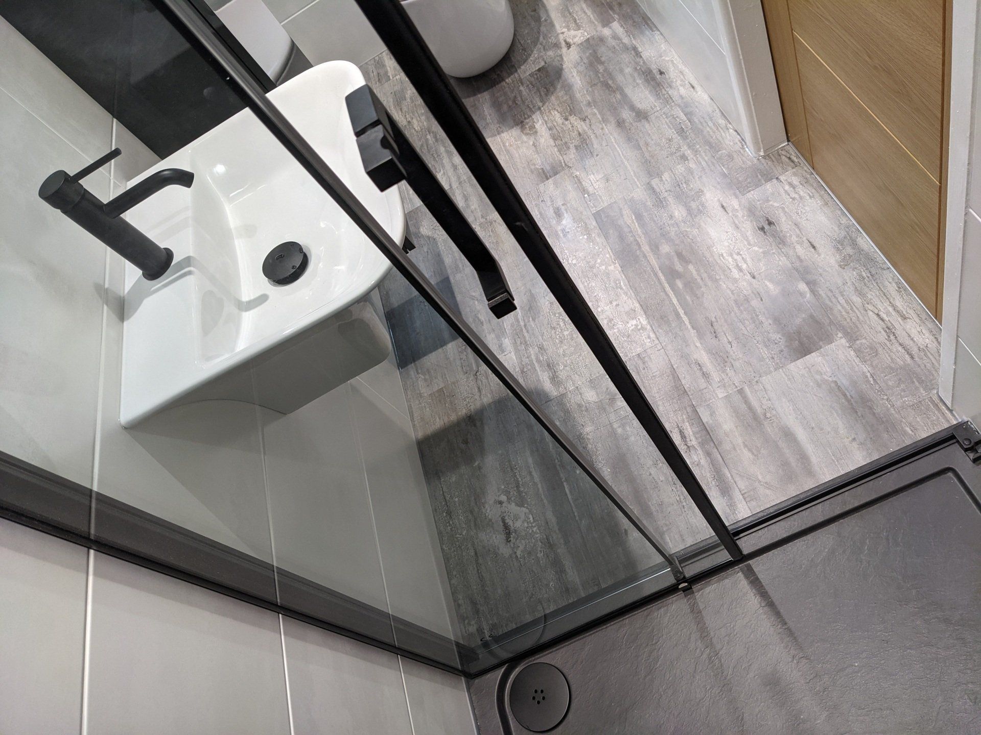 An en-suite without chrome, replaced with a monochrome colour scheme. The vinyl click flooring is an obscure wooden design, but complements the space superbly.
