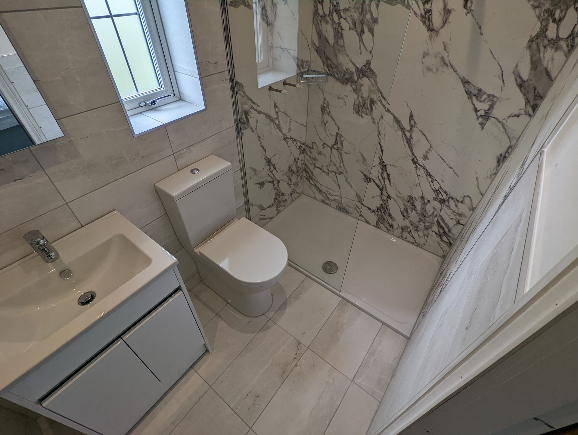 A mixture of whites, tiles & wall boards bring a crisp & modern look to this en-suite.