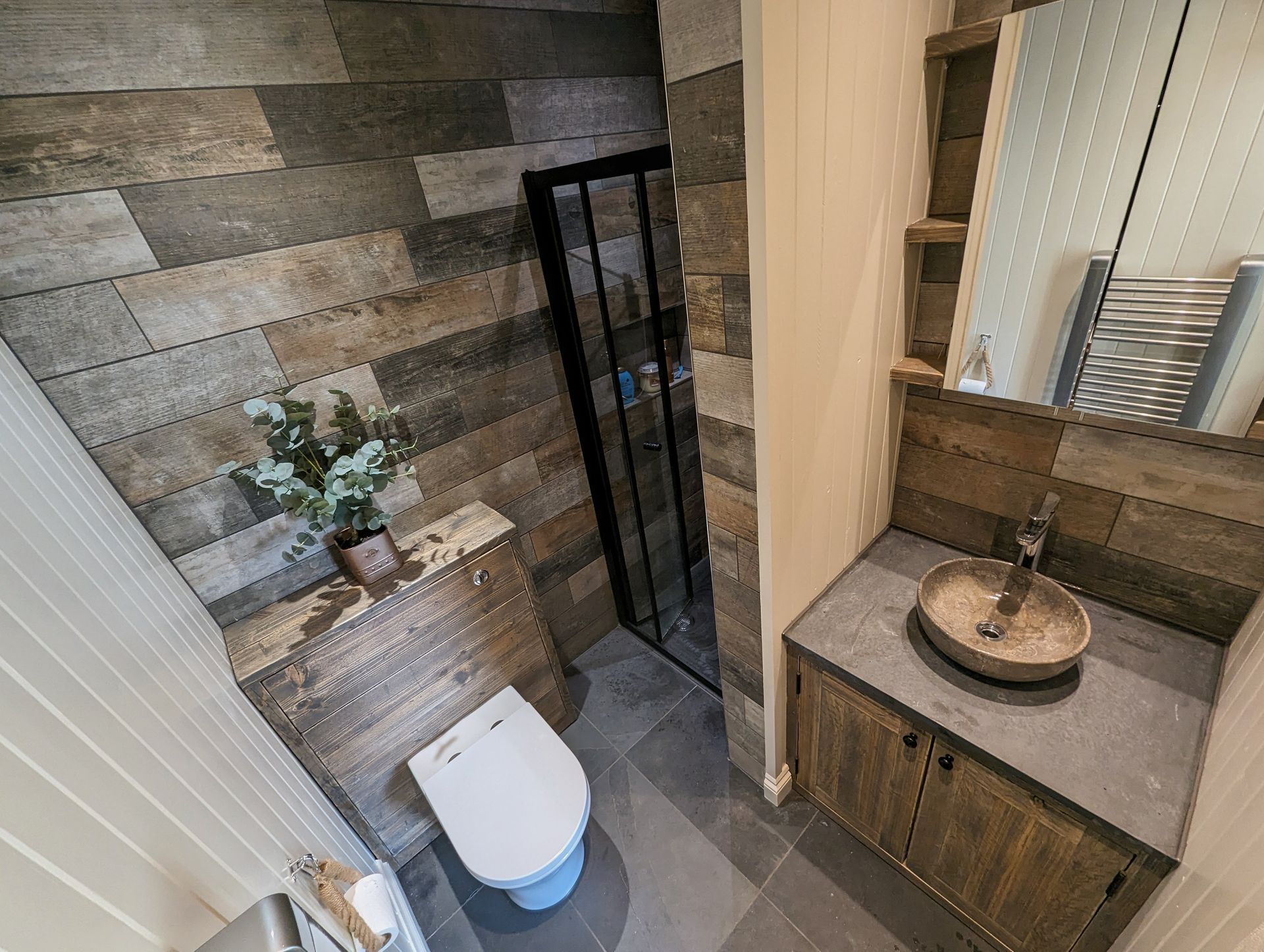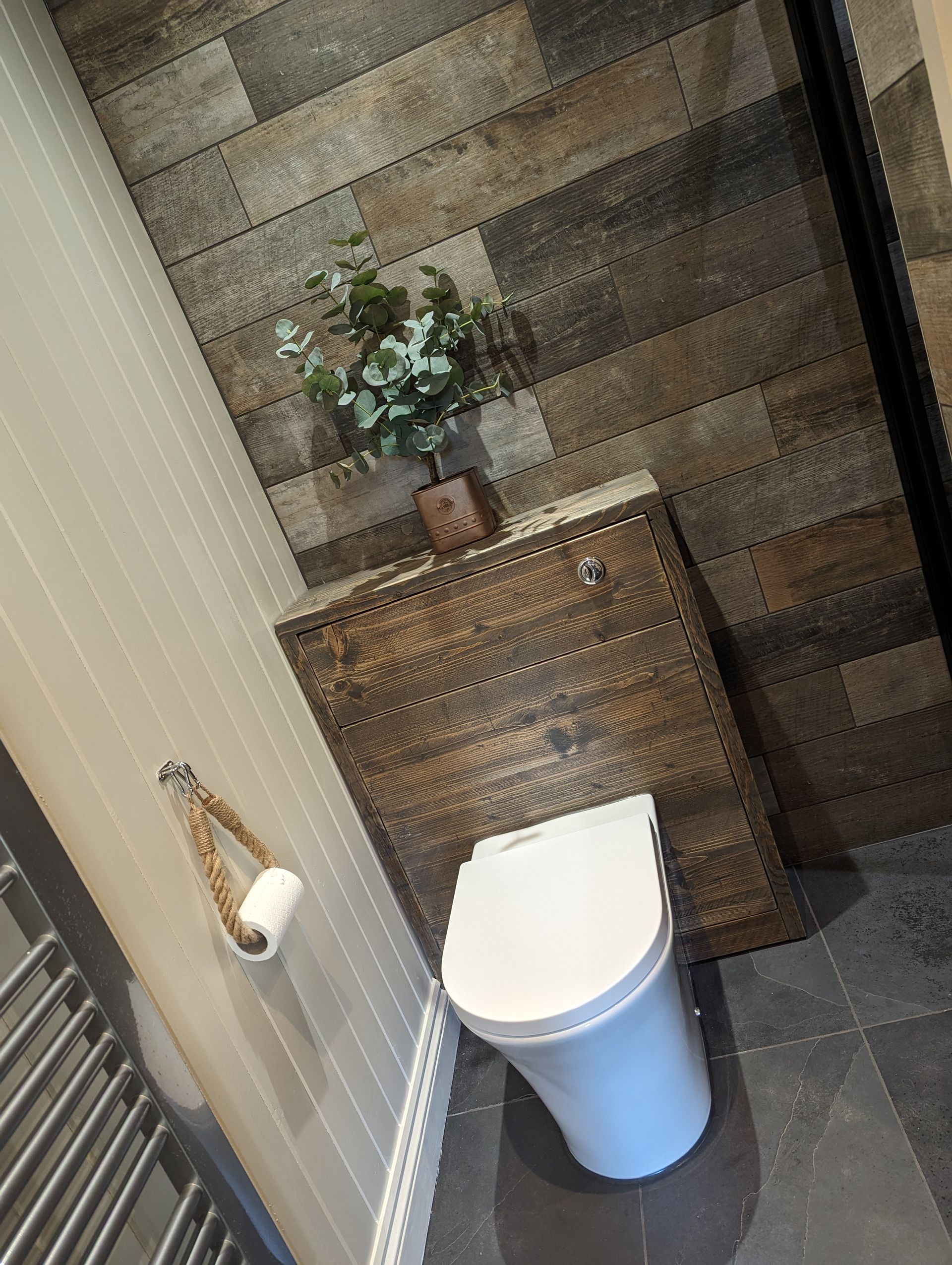 A marriage of textures and finishes. Timber tiles, painted tongue & groove cladding, skirting boards & a custom built WC unit.