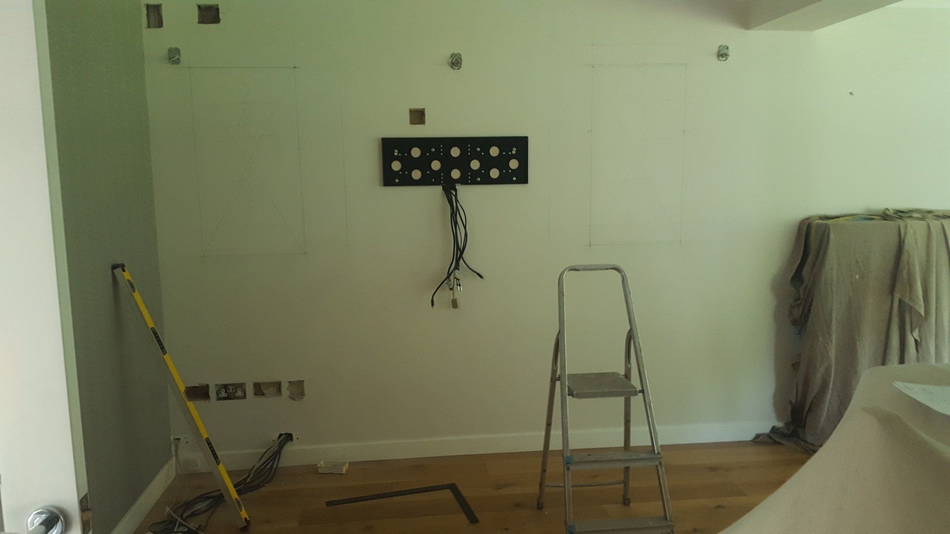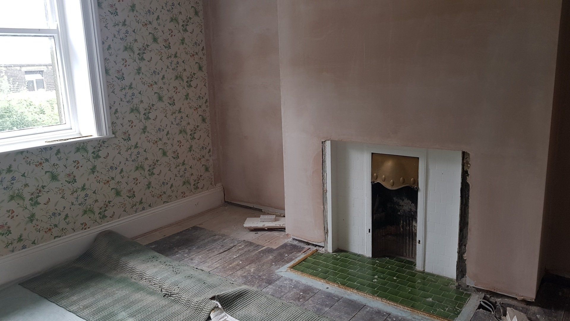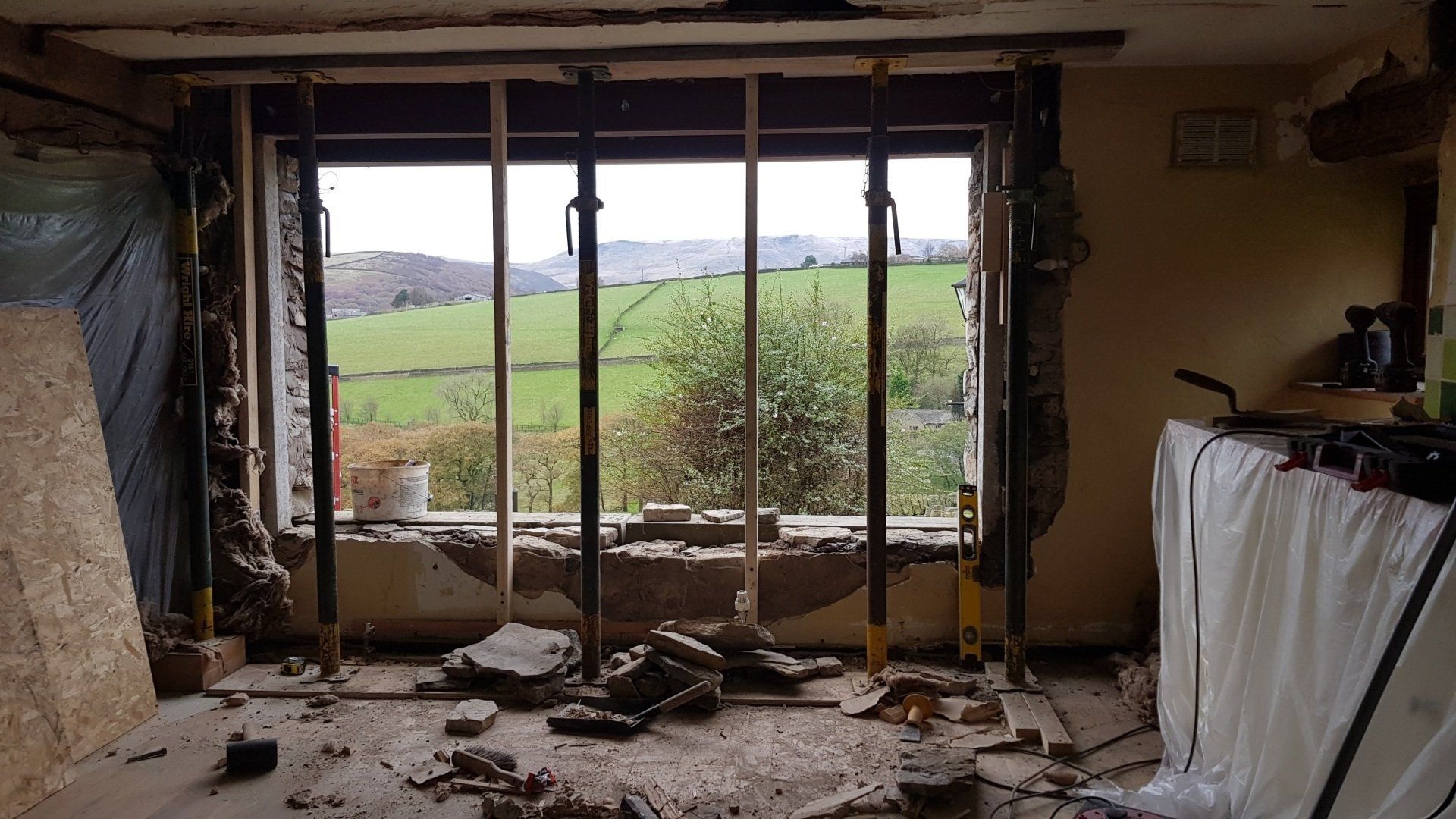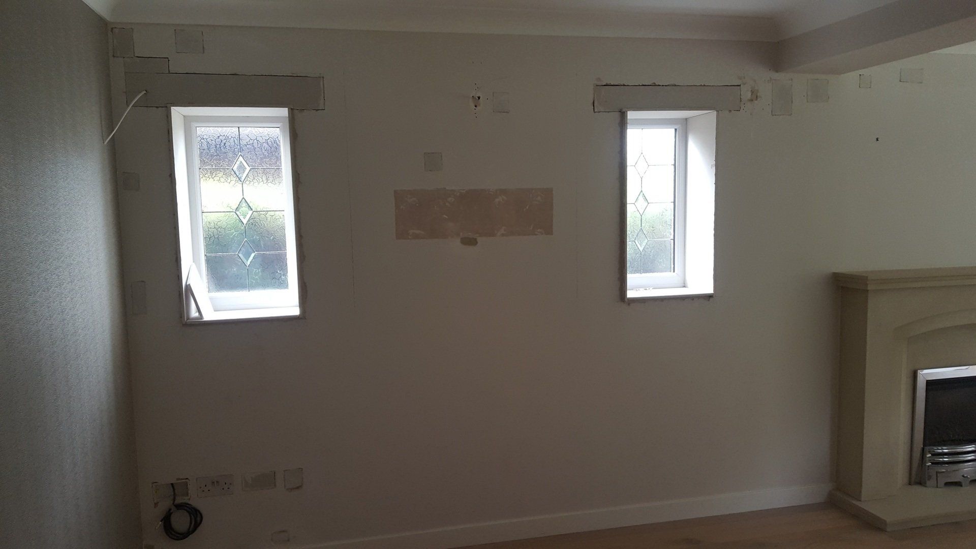This lounge was lacking in natural light. Two new window openings were marked ready to be opened, making allowances for the chimney breast on the external side of the wall.