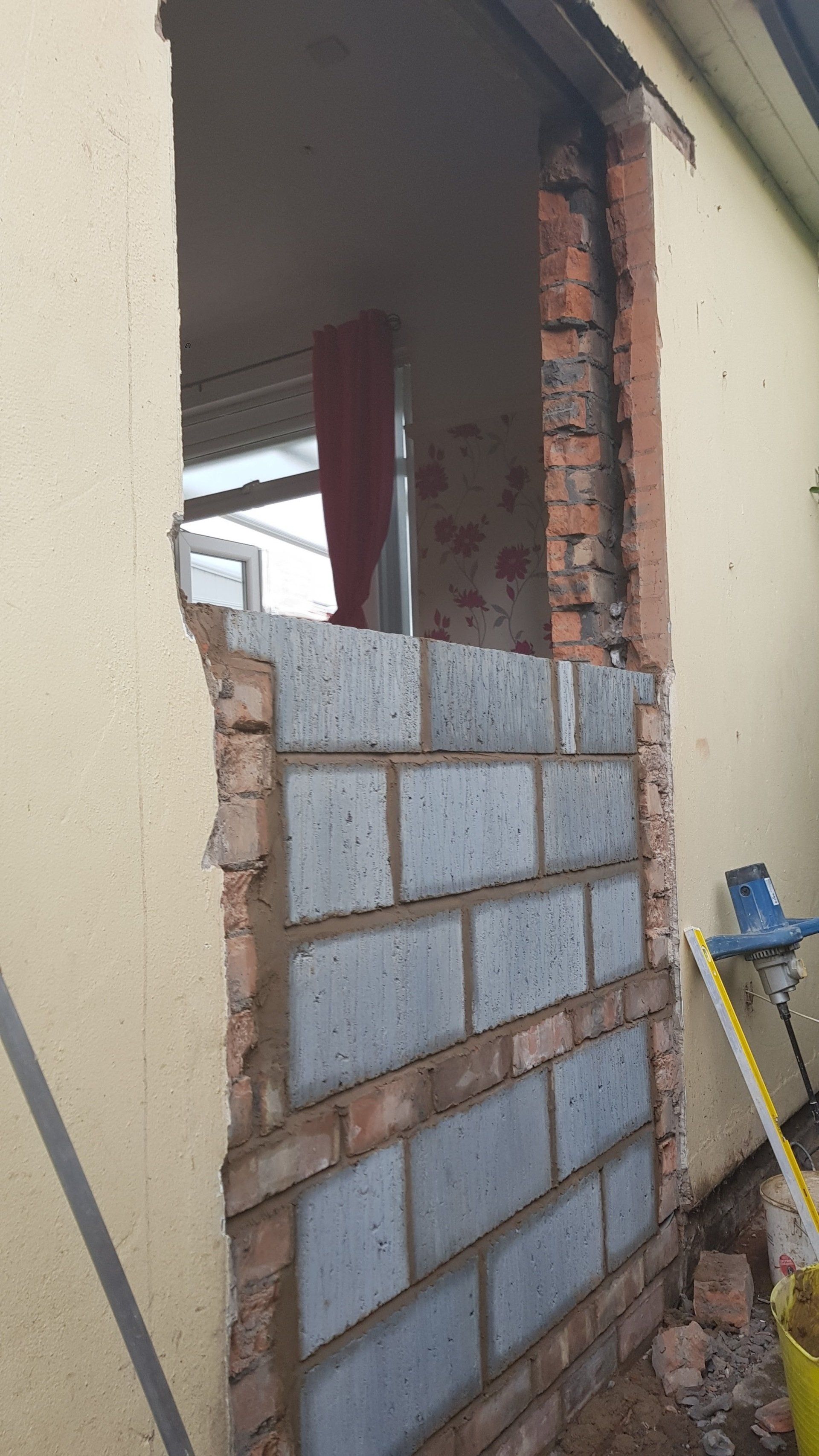 The wall was built back up to the required level and a lintel fitted, ready for the window and render before moving inside.