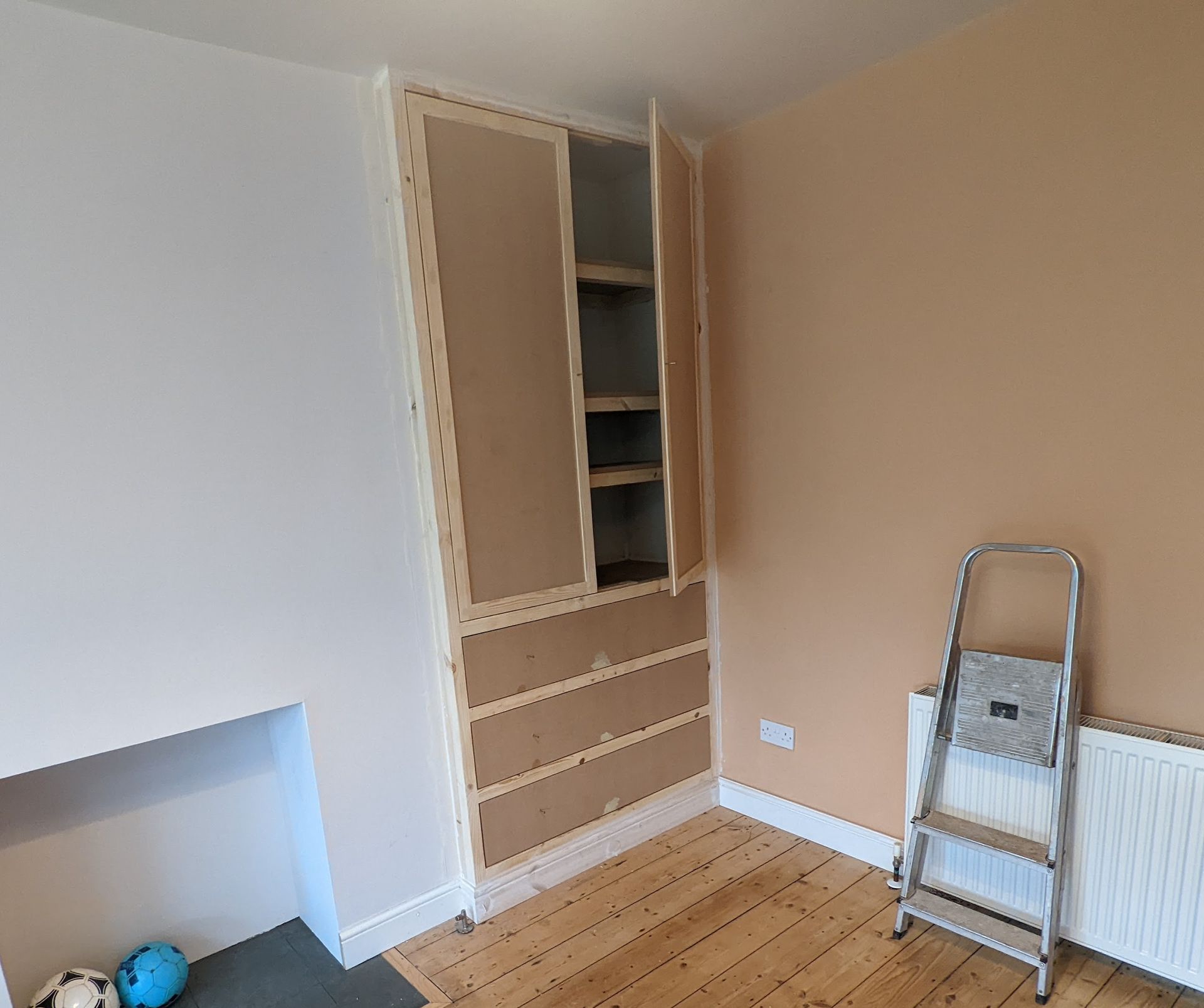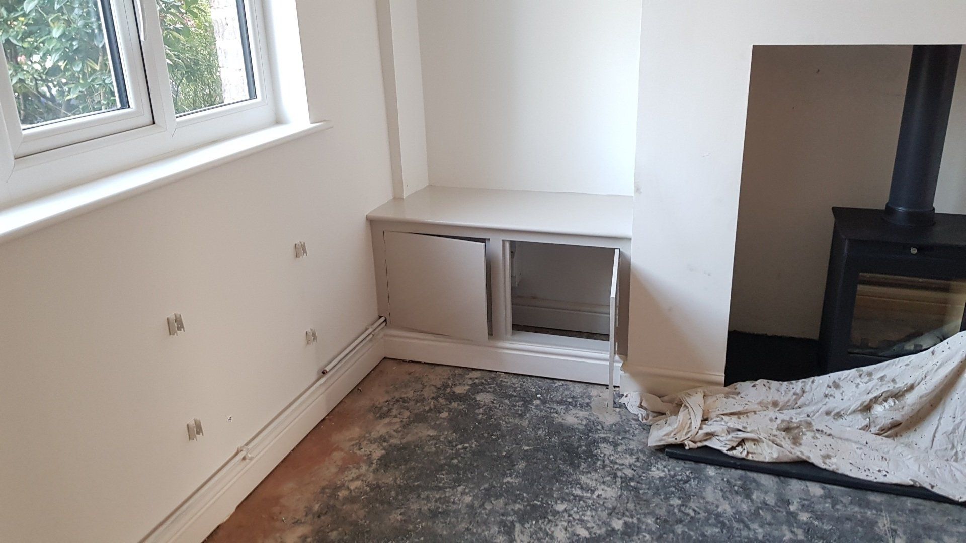 Installation of some new alcove storage in this lounge, featuring drawers, shaker style doors & heavy duty shelving within.