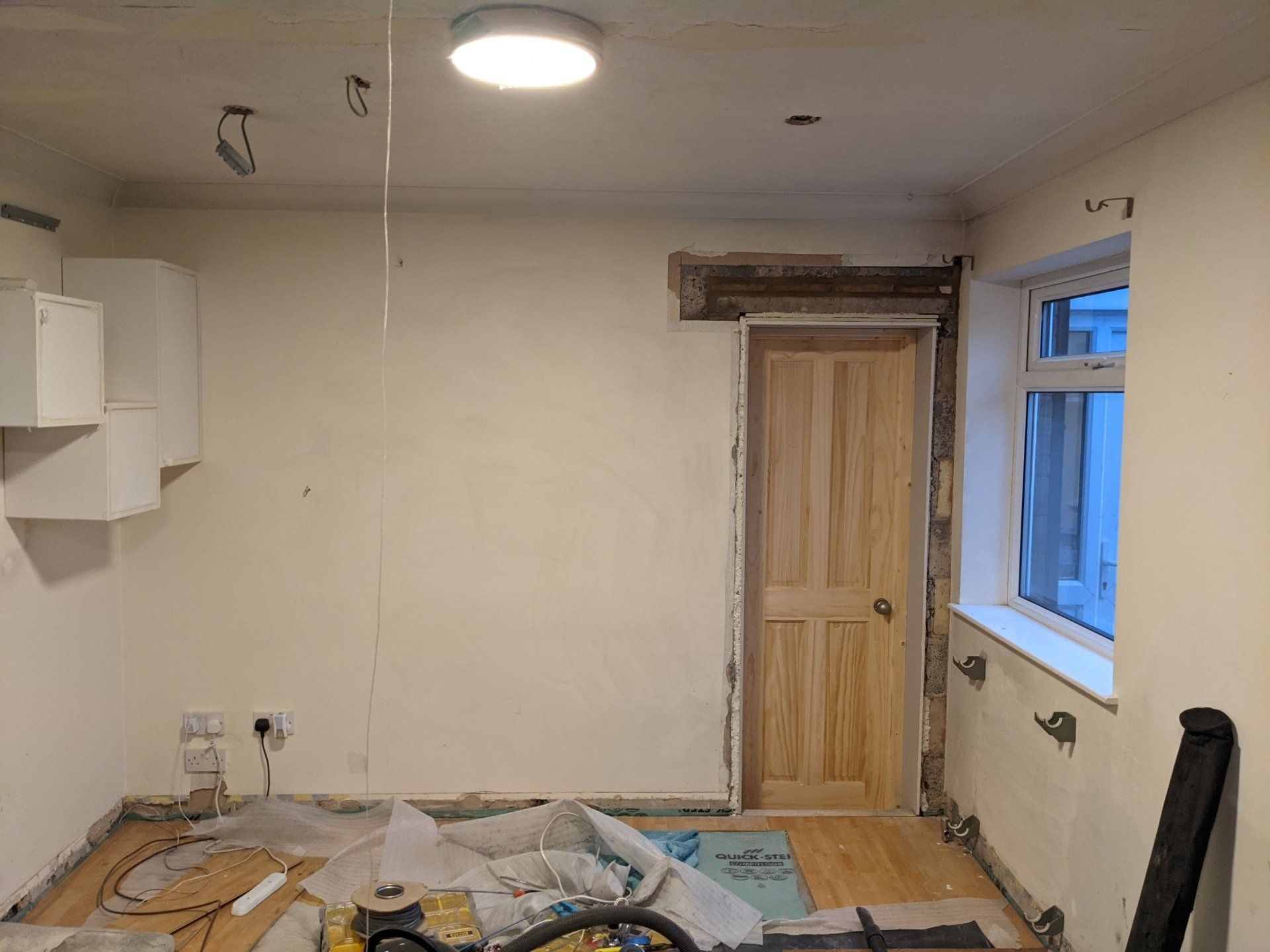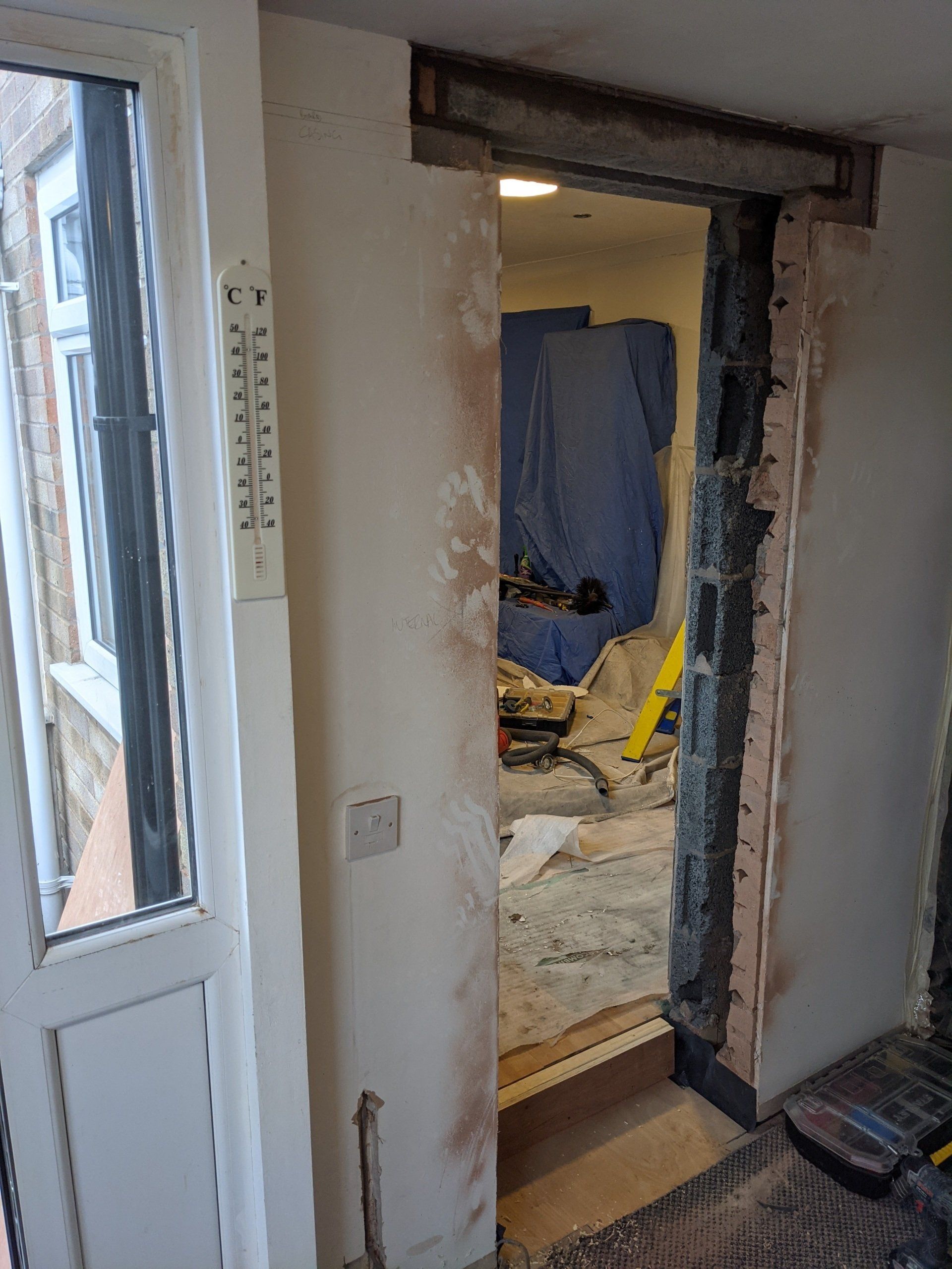 A knockthrough to link the lounge with the soon to be study/spare room. The hole was made, the lintels were fitted and the step between the two floor levels was prepped.